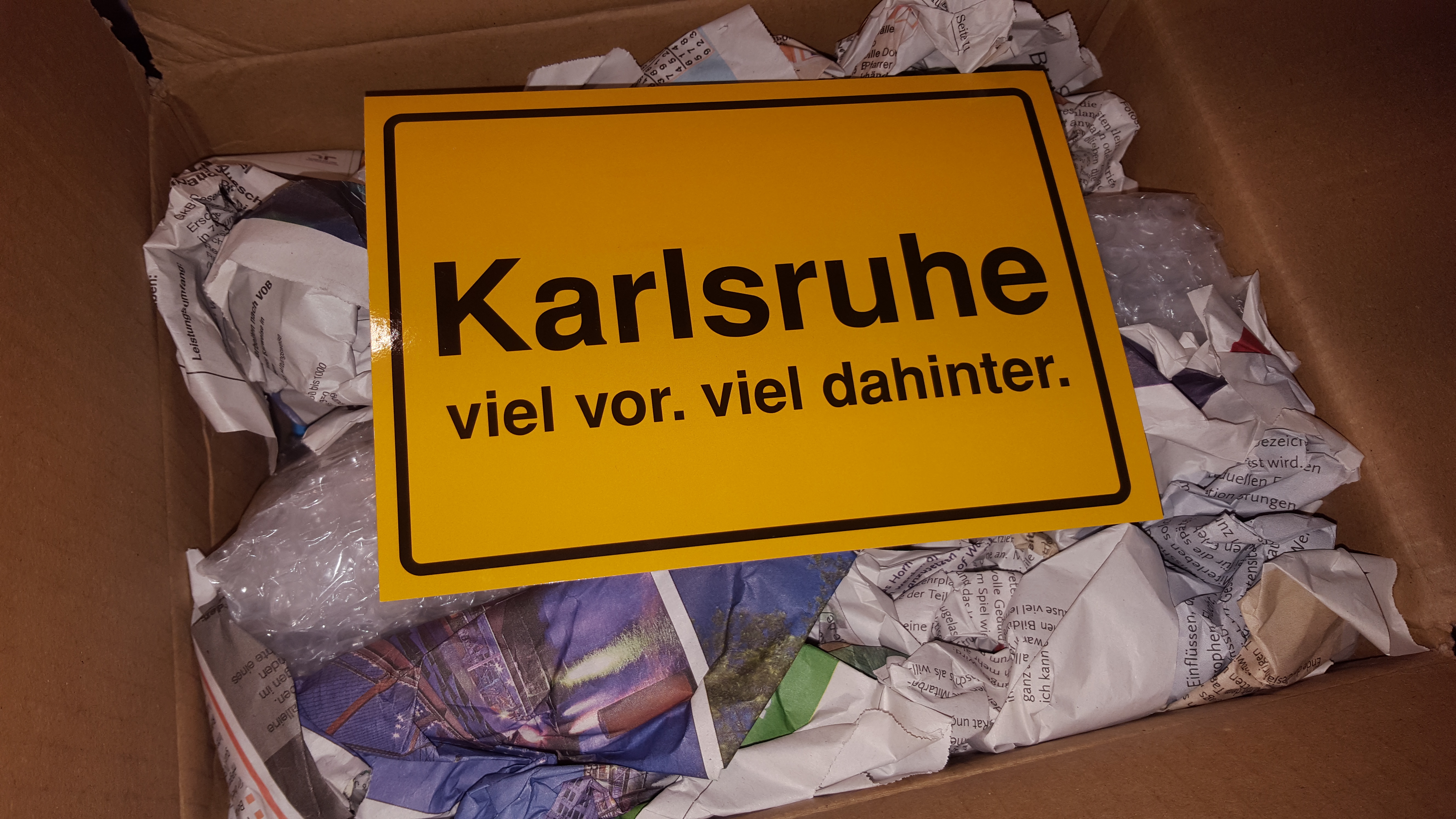 Voller Spannung hab ich es aufgemacht und als Erstes lachte mich eine Postkarte an - im Ortsschildstyle. Diese Art von Postkarte ist bei Postcrossern übrigens höchst begehert :-P