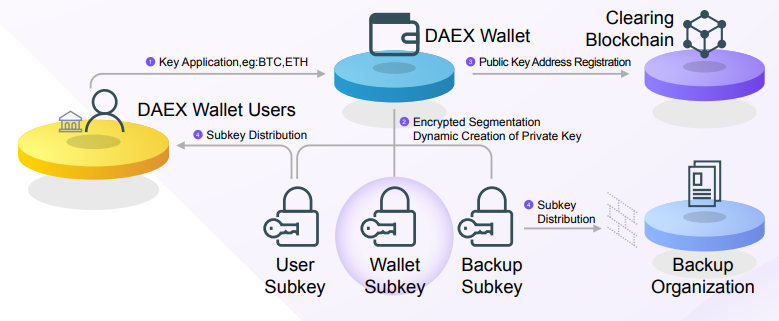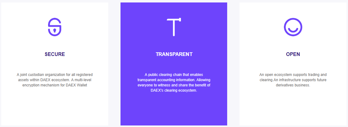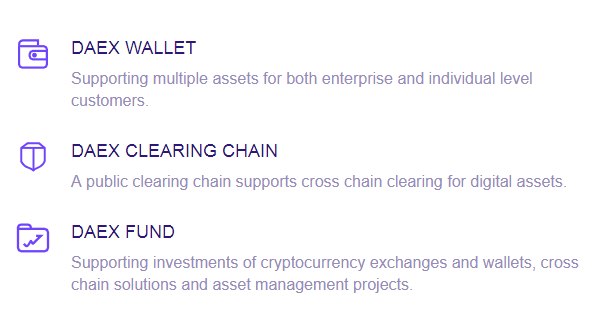 Ekosistem DAEX ialah layanan kliring yang berlandaskan teknologi ledger, perdagangan secara terpusat dan penguna dompet.