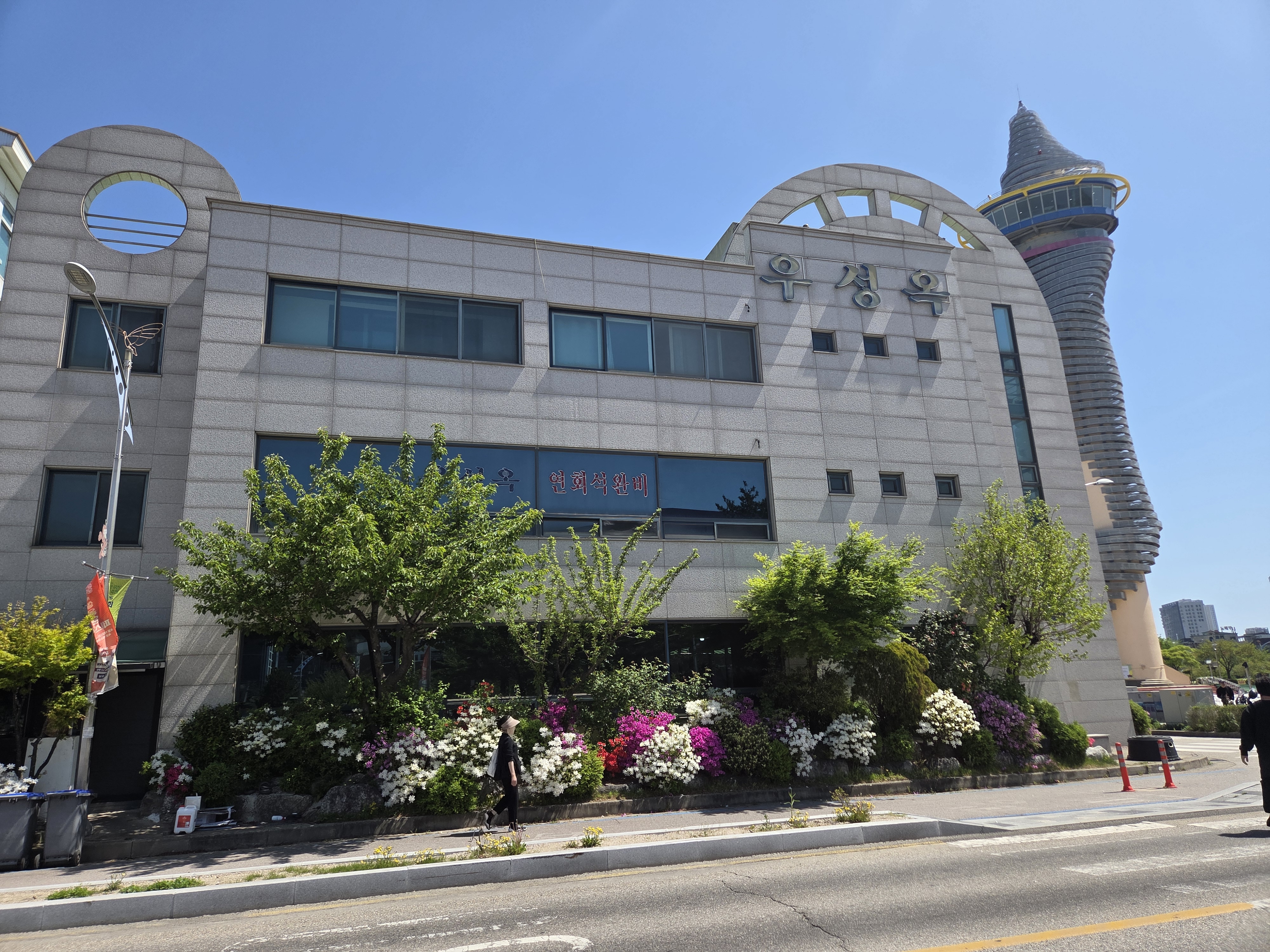 사람이 너무 많아 걷기가 힘드니 한적한 곳을 찾아 시엄니와 둘이 앉아 있었어요
