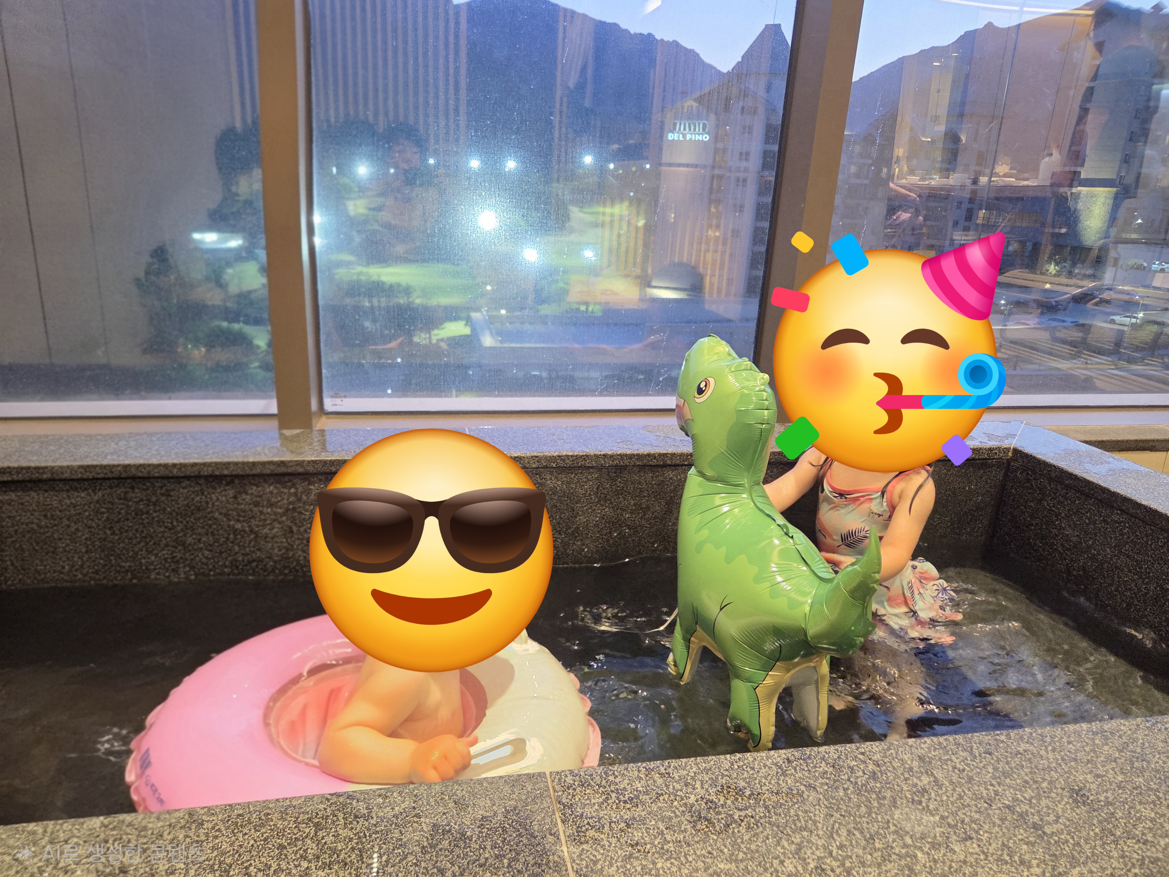저녁 식사후 시간이 흐른뒤 손주들은 온천수 물놀이로 하루를 마감하고요