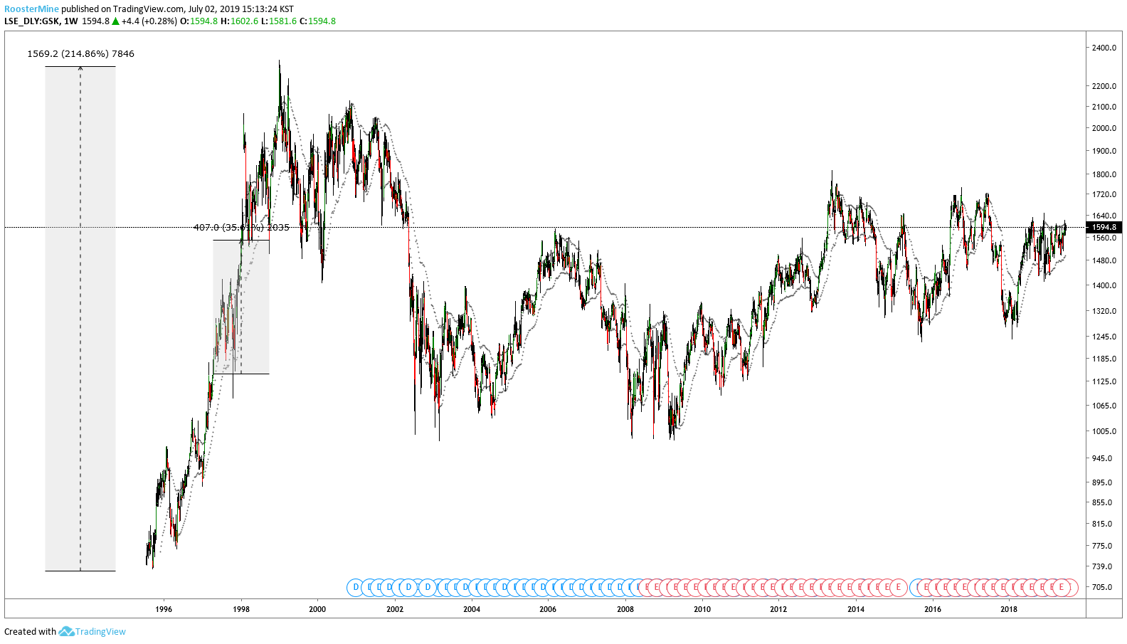 GSK: 전형적인 거품 같은 상승 이후 조정. 심지어 거품도 200% 바께 안대고, 진입 기회는 1번. 35% 수익