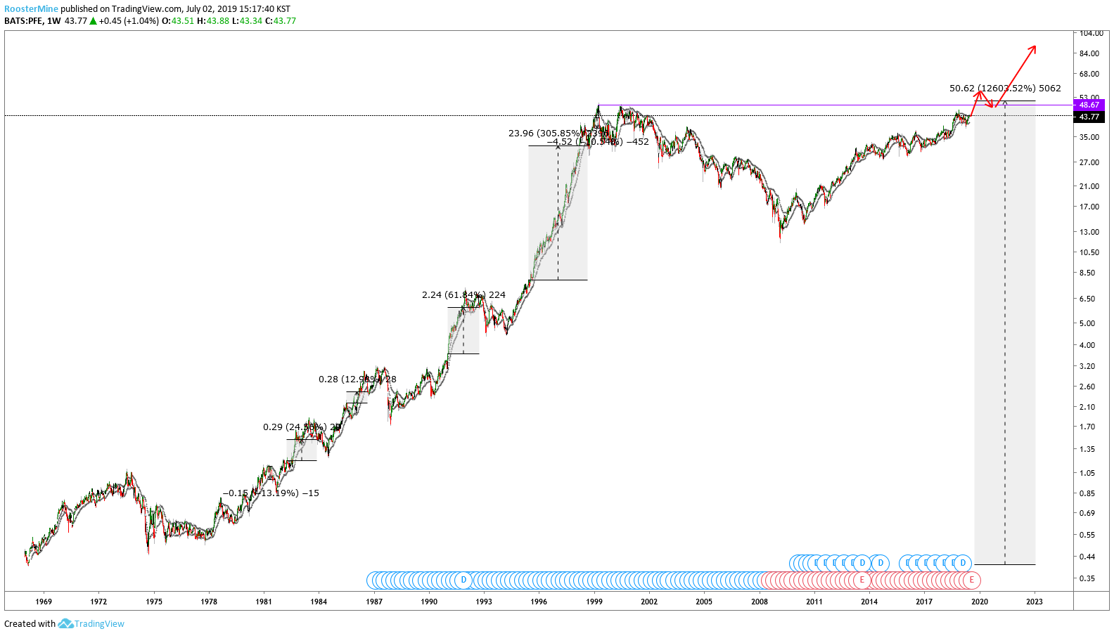 Pfizer: 6번의 매수 기회 (-13.19% / 24.56% / 12.96% / 61.84% / 305.85% / -10.54%) 손절 두번 정도 발생하고 나머지는 수익. 이런 차트 볼때마다 굳이 코인을 할 필요가 없다라는 생각이 든다... ㅎㅎㅎㅎ 특히 직장인 분들... 거의 저점 대비 123배 올랐군. 뭐 오래됬으니깐 인플레이션하고 뭐고 하면 ... 그래도 123배는 경이로운 숫자다.