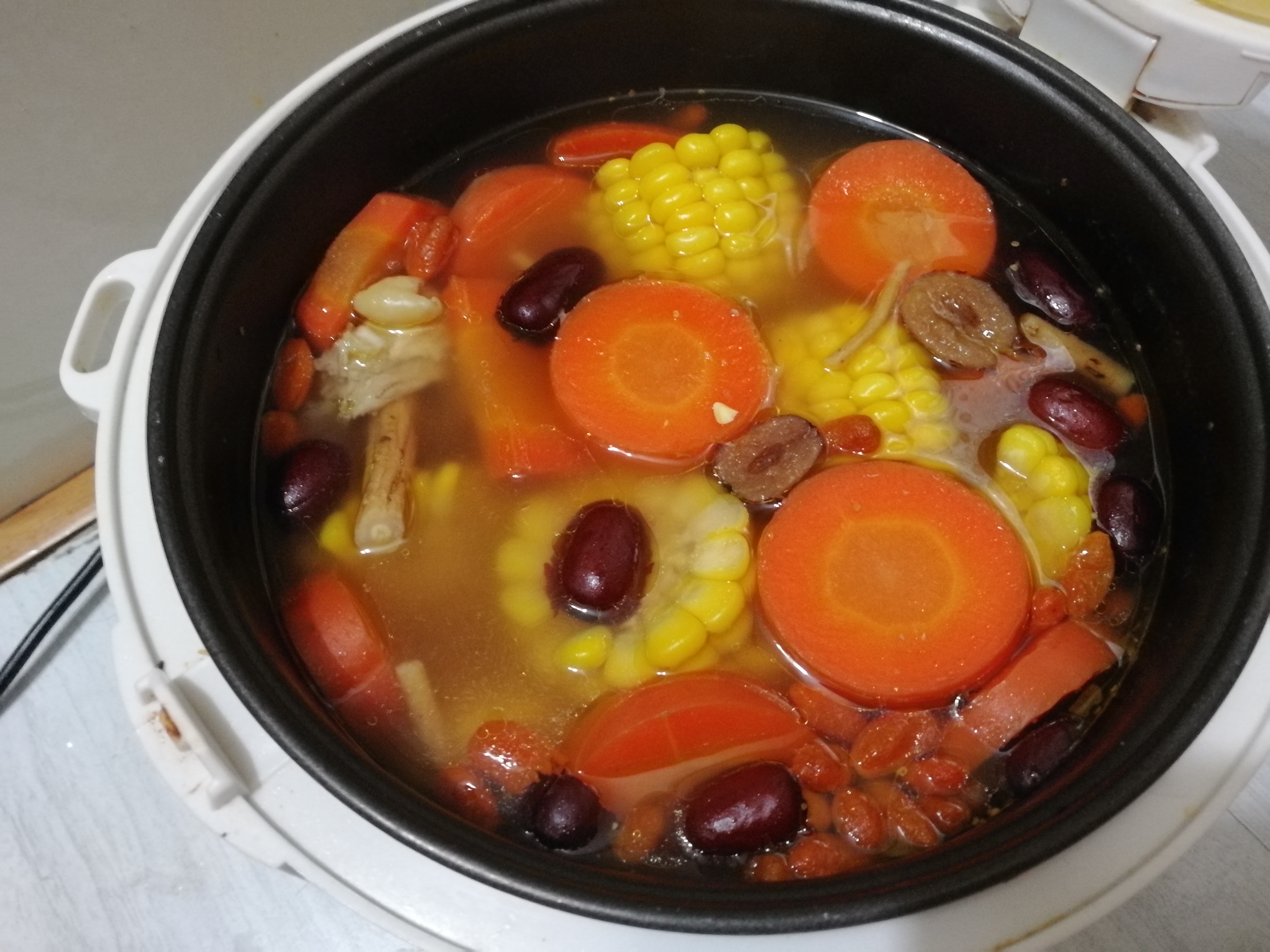 然后把玉米胡萝卜一起放进去煮,盖上盖子,煮半个小时左右,在把枸杞红枣,放进去一起煮,大概15分钟后就可以喝啦😄我喜欢煲汤也有一个原因,因为我可以煮好多,一个人静静地坐在家里喝,一直喝都可以😂因为我特别喜欢喝汤!自己煲的汤也比较浓郁,没有添加剂,比较健康!哈哈