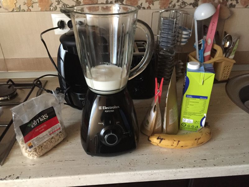 Milkshake : milk, 1 banana, speanuts, 1 teaspoon of spirulina, 1 teaspoon of green barley powder