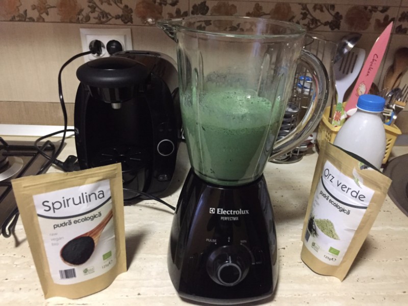 Milkshake : milk, 1 banana, 1 teaspoon of spirulina, 1 teaspoon of green barley