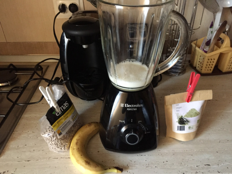 Milkshake : milk, 1 banana, sunflower seeds, 1 teaspoon of green barley