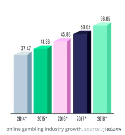 抛开传统的线下赌场,在线博彩行业也是冉冉升起的一颗新星。我们再看另外一份来自statista的数据。2016年在线博彩行业市值450亿美元(请和利润区分开),预计到2018年将达到560亿,每年是10%的增长率。这个盘子和蛋糕足够大,即使只分一小块都能赚得锅碗瓢盆都满了。
