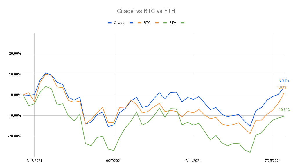 DAOventures offers users a lot of features and financial tools to generate income. In this line of ideas, we have one of the best features of this platform which is DAO CITADEL. It is an investment strategy which purpose is to provide interoperability and exposure to Bitcoin, Ethereum and others ERC-20 altcoins while allowing big returns thought yield farming by providing liquidity to DEXs and lending protocols. The basic concept in order people can understand the performance, is to provide liquidity in established pairs to platforms like SushiSwap, CRV, Pickle. The portfolio is established with the following structure: Bitcoin, Ethereum, Ethereum-based Alts and Stablecoins; each one has its own weight.