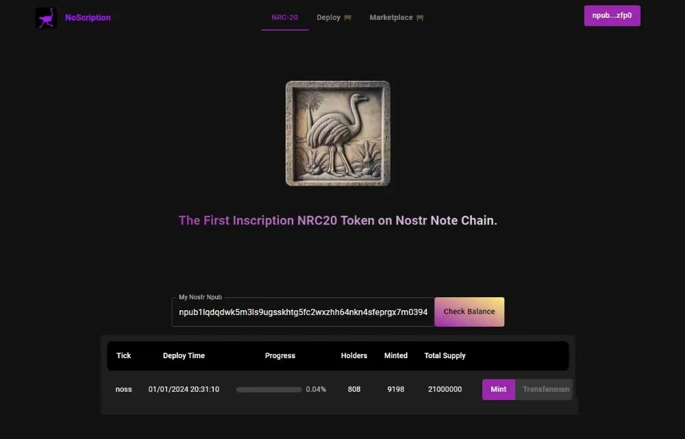 比特币闪电网络的第一个铭文 $NOSS总量:2100万个,每挖成功一次分到10个