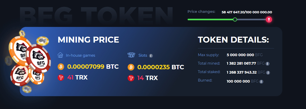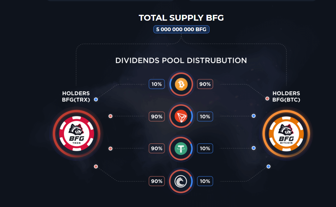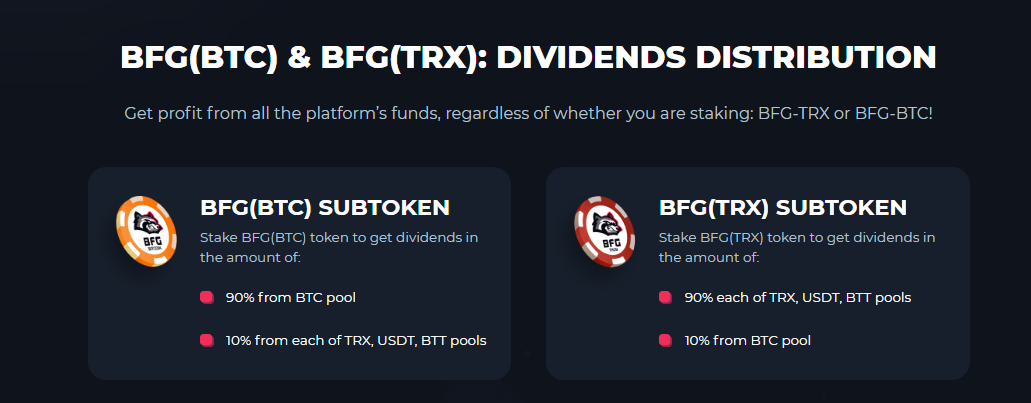 They are two types of "shares" of the casino which you can "mine" through playing their games, the difficulty of mining would be increasing overtime. They are called as BFG tokens, BTC BFG Tokens and TRX BFG Tokens, which are mined by playing casino games with BTC or TRX. You would be able to receive BTC, TRX, BTT and USDT dividends based on the following proportions.