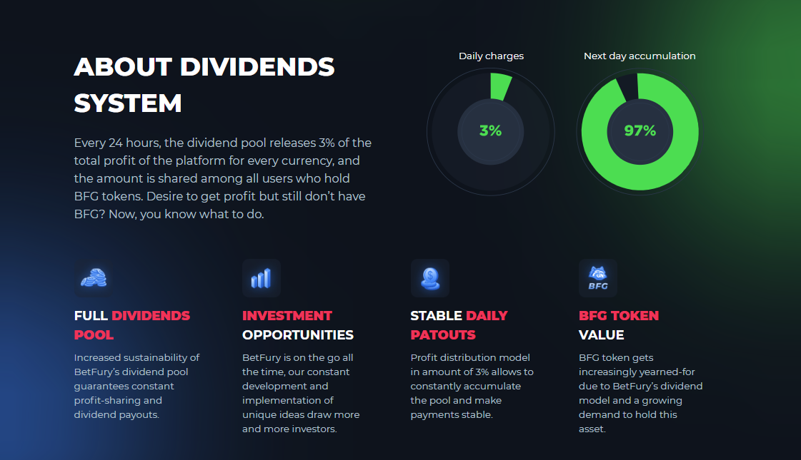 only 3 % from the dividend pool will be distributed every day, and it attract people to play more to mine more BFG tokens, creating a positive cycle.