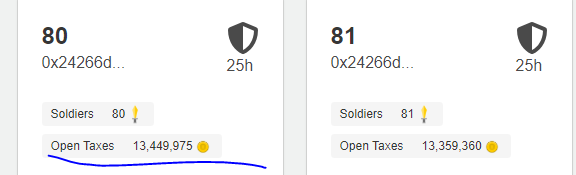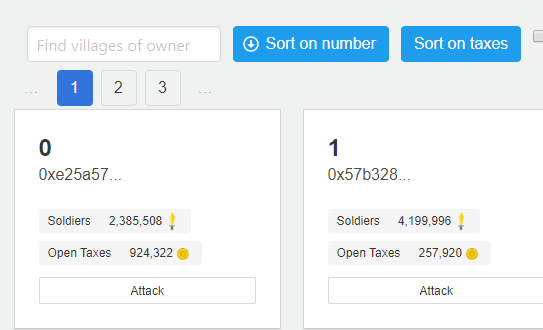 notice that the villages created first have more gold yield per block. each village you want to collect taxes from costs 0.001 eth, So be smart when you collect your taxes(yield per cost).