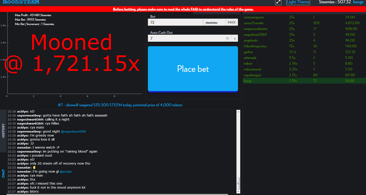 Ha ha, this is a funny and spot on review. I've had three swings of playing, losing and saying 'that's it'....the last time was coz it mooned at 1.0x 2/3 times in a row. The first time I ever played, I witnessed a massive run (you can see where I cashed out below lol). Nice one Atnazo :D