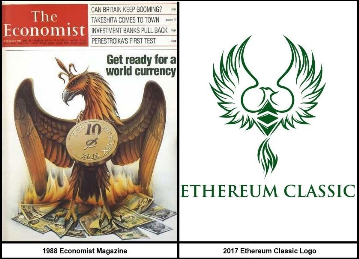 Bild: Cover Economist 1988 vs. Ethereum Classic Logo 2017