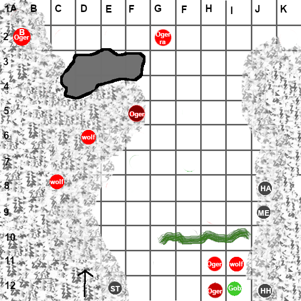gob ses the two oger in the road the are getting ready to shoot they crossbows he casting his berserk at one of them the oger turns a round and instead of shooting at gob he killes his ally in two shoots then fire at a different oger hurting him badly, gob is casting a secone berserk spell on a second oger before he summons a nettles wall in front of him and blocking line of sight. the oger hits his ally next to him then wandering arund. @stever82 is taking a swing at a oger next to him his opponent is bigger then him he ses his ally are hiding and falling back he joining them. @hhayweaver ses and opportunity to take a shot at one of the oger ho shoot maxwell and @methus. his arrow missing him. he manage to hide to ready his ambush.