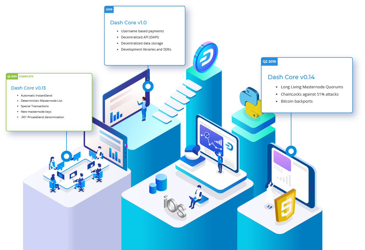 Die Seite enthält auch eine detaillierte Roadmap für die kommende Veröffentlichung von v0.14 und v1.0 (auch bekannt als Evolution). Die nächste Version v0.14 wird ChainLocks enthalten, eine Funktion, die Dash resistent gegen 51%-Angriffe machen wird.