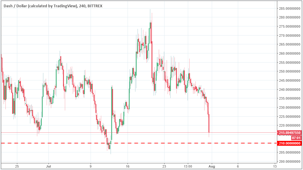 DASH on a long term support ($210). The price is testing again this level, but, having a look at a short time frame, the price is literally falling and I have reason to believe that there will be a breakout with DASH going towards $200 in August.