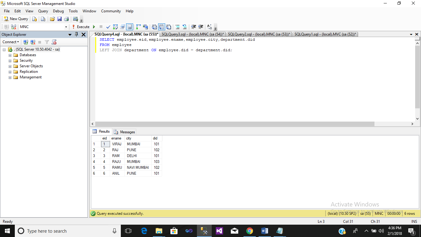 Hello Friend Today In This Blog I Will Show You How To Use Different Type Of Mssql Joins .A JOIN clause is used to combine rows from two or more tables, based on a related column between them.The INNER JOIN keyword selects records that have matching values in both tables.The LEFT JOIN keyword returns all records from the left table (table1), and the matched records from the right table (table2). The result is NULL from the right side, if there is no match.The RIGHT JOIN keyword returns all records from the right table (table2), and the matched records from the left table (table1). The result is NULL from the left side, when there is no match.The FULL OUTER JOIN keyword return all records when there is a match in either left (table1) or right (table2) table records.A self JOIN is a regular join, but the table is joined with itself.A SQL JOIN combines records from two tables.A JOIN locates related column values in the two tables.A query can contain zero, one, or multiple JOIN operations.INNER JOIN is the same as JOIN; the keyword INNER is optional.(INNER) JOIN: Select records that have matching values in both tables.LEFT (OUTER) JOIN: Select records from the first (left-most) table with matching right table records.RIGHT (OUTER) JOIN: Select records from the second (right-most) table with matching left table records.FULL (OUTER) JOIN: Selects all records that match either left or right table records.The SQL Joins clause is used to combine records from two or more tables in a database. A JOIN is a means for combining fields from two tables by using values common to each.Here, it is noticeable that the join is performed in the WHERE clause. Several operators can be used to join tables, such as =, <, >, <>, <=, >=, !=, BETWEEN, LIKE, and NOT; they can all be used to join tables. However, the most common operator is the equal to symbol.A SQL Join statement is used to combine data or rows from two or more tables based on a common field between them.INNER JOIN: The INNER JOIN keyword selects all rows from both the tables as long as the condition satisfies. This keyword will create the result-set by combining all rows from both the tables where the condition satisfies i.e value of the common field will be same.LEFT JOIN: This join returns all the rows of the table on the left side of the join and matching rows for the table on the right side of join. The rows for which there is no matching row on right side, the result-set will contain null.RIGHT JOIN: RIGHT JOIN is similar to LEFT JOIN. This join returns all the rows of the table on the right side of the join and matching rows for the table on the left side of join. The rows for which there is no matching row on left side, the result-set will contain null. FULL JOIN: FULL JOIN creates the result-set by combining result of both LEFT JOIN and RIGHT JOIN. The result-set will contain all the rows from both the tables. The rows for which there is no matching, the result-set will contain NULL values.There are four basic types of SQL joins: inner, left, right, and full. The easiest and most intuitive way to explain the difference between these four types is by using a Venn diagram, which shows all possible logical relations between data sets. Let's use the tables we introduced in the “What is a SQL join?” section to show examples of these joins in action. The relationship between the two tables is specified by the customer_id key, which is the "primary key" in customers table and a "foreign key" in the orders table.Let’s say we wanted to get a list of those customers who placed an order and the details of the order they placed. This would be a perfect fit for an inner join, since an inner join returns records at the intersection of the two tables.If we wanted to simply append information about orders to our customers table, regardless of whether a customer placed an order or not, we would use a left join. A left join returns all records from table A and any matching records from table B.Right join is a mirror version of the left join and allows to get a list of all orders, appended with customer information.Finally, for a list of all records from both tables, we can use a full join.A SQL join is a Structured Query Language (SQL) instruction to combine data from two sets of data (i.e. two tables). Before we dive into the details of a SQL join, let’s briefly discuss what SQL is, and why someone would want to perform a SQL join.SQL is a special-purpose programming language designed for managing information in a relational database management system (RDBMS). The word relational here is key; it specifies that the database management system is organized in such a way that there are clear relations defined between different sets of data. Typically, you need to extract, transform, and load data into your RDBMS before you’re able to manage it using SQL, which you can accomplish by using a tool like Stitch.An SQL JOIN clause combines rows from two or more tables. It creates a set of rows in a temporary table.A JOIN works on two or more tables if they have at least one common field and have a relationship between them.JOIN keeps the base tables (structure and data) unchanged.