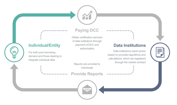 DCC tokens will also be used to pay for jobs in a DCC ecosystem. In a DCC system, the people that require data or reports from data institutions also need to pay and DCC tokens for these services. Furthermore, credit institutions also need to pay DCC tokens to the certification body when verifying the validity of the data. And in addition, individuals applying for credit also need to pay in DCC tokens for the application contract. The entire ecosystem distribution of interest can be dynamically adjusted so that the credit processing resources can be tilted towards individuals but more DCC tokens.