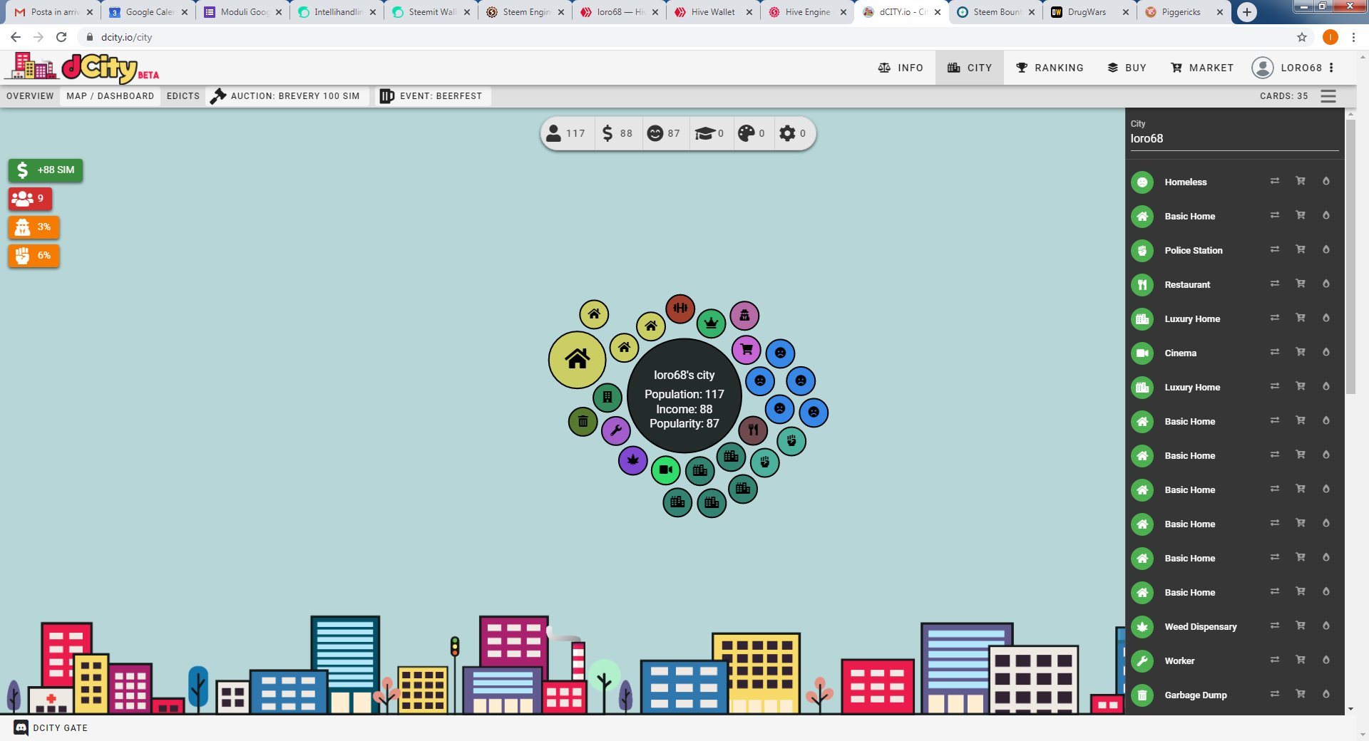 This game is based on build up an own town, where you can make new house and buy cards connected with the services needed for a town like shops, factories, cinema and so on.