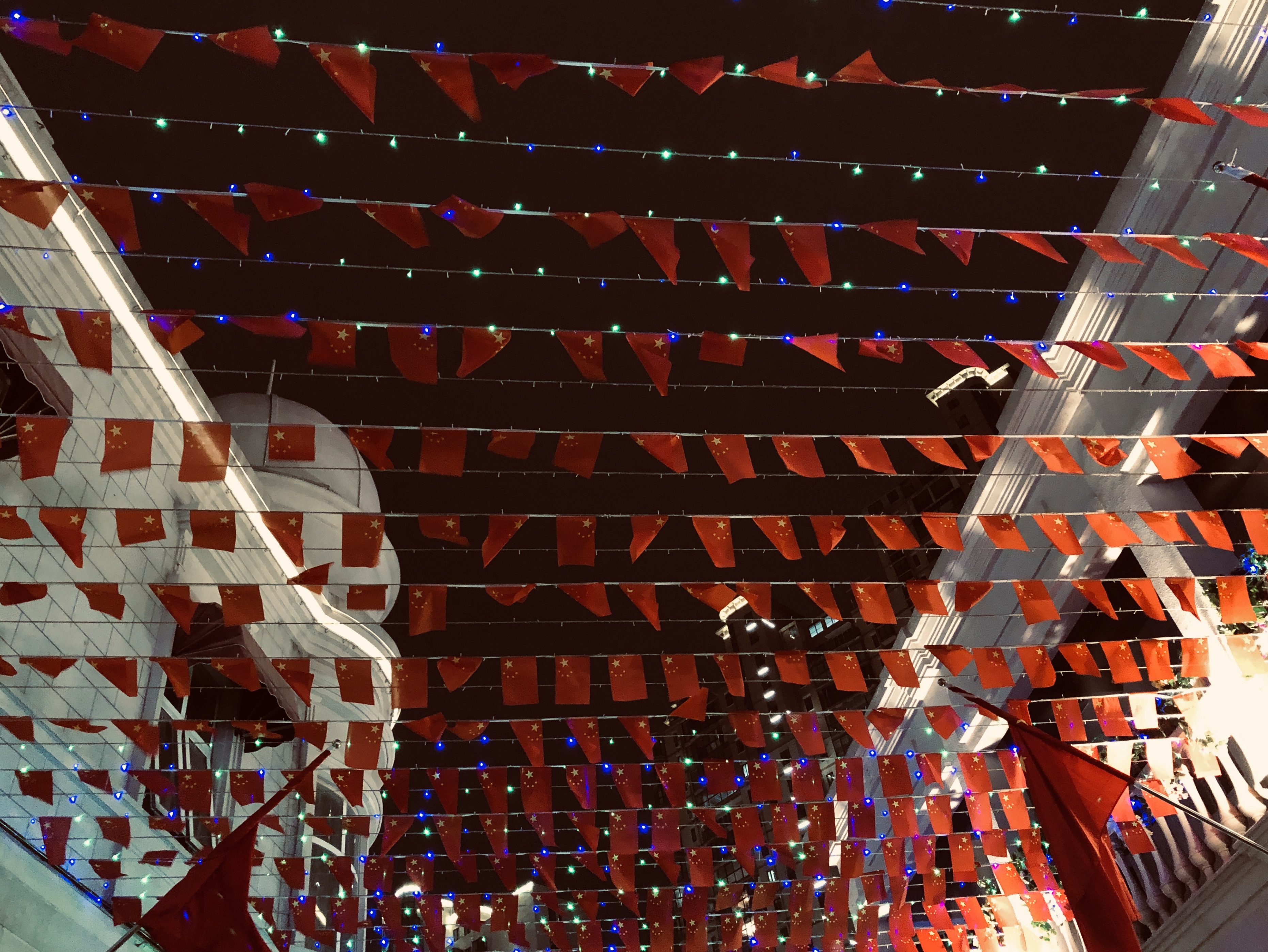 (만국기가 휘날리던 유럽거리에는 국경절을 맞아 중국 홍기가 가득합니다)