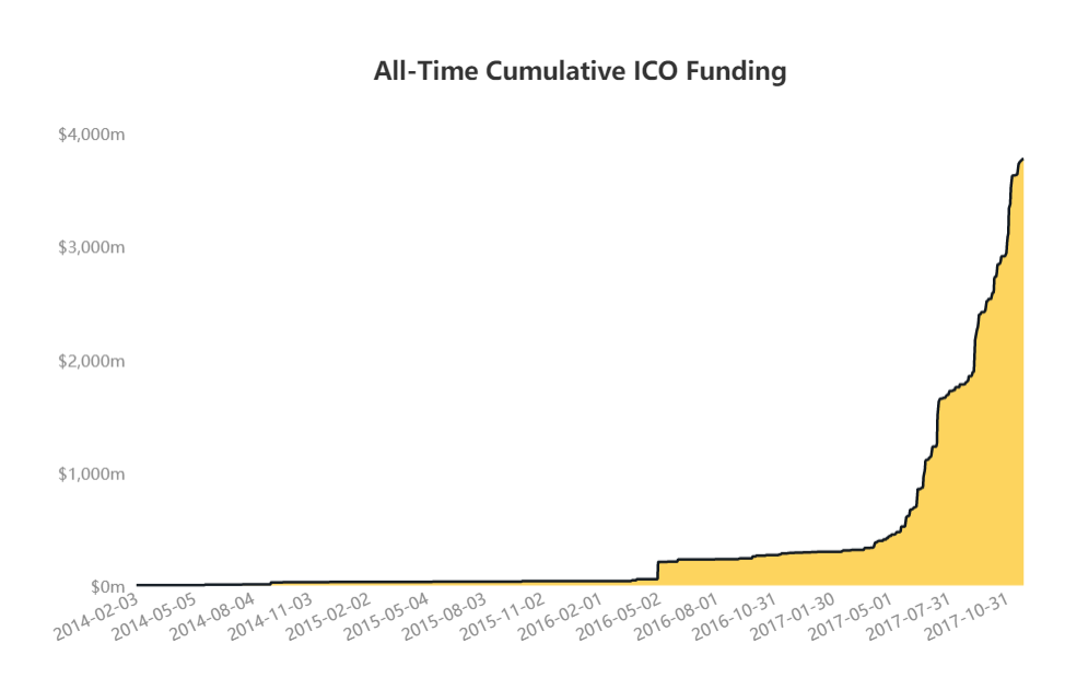 Die Technologie ermöglicht, dass für alle Beteiligten klar ersichtlich ist, ob, wann und in welcher Höhe Transaktionen stattgefunden haben. Diese eröffnet neue Möglichkeiten für digitale Märkte, die demokratisch aufgebaut sind und viel besser Skalieren als bestehende Systeme. Der Vorsitzender der Investment Bank LHV Bank in Estland Rain Lohmus erklärte, dass Blockchain die am besten getestete und sicherste Technologie für Anwendungen für das Bankwesen und für die Finanzierung sei.[6] Durch den Aufschwung des Bitcoins und die damit verbundene Wertsteigerung der digitalen Onlinewährung ist mittlerweile ein völlig neuer Markt entstanden. Die bringt, neben dem Handel mit bestehenden kryptographischen Währungen auch eine neue Finanzierungsmöglichkeit von Start-Ups, mit sich. Die Möglichkeit sich über ICOs, Initial Coin Offerings, zu finanzieren, ermöglicht jungen Unternehmen eine neue Möglichkeit ihr Projekte zu fundieren. Ein ICO ähnelt dem an Börsen üblichen Mittel der IPO, Initial Public Offering, nur dass anstelle von Unternehmensanteilen vorab Token, welche auf der neu ergründeten Plattform als Zahlungsmittel fungieren sollen, ausgestellt werden. So haben sich in der Vergangenheit Plattformen vorgestellt, welche beispielsweise das zeitlich begrenzte Vermieten von Wohnungen ermöglichen sollen. Dabei wird einem Investor, abhängig von seiner Investitionsmenge Tokens ausgeschüttet, die über bestehende Börsen und Netzwerke miteinander getauscht werden können. Im Vergleich zum Branchenriesen Airbnb können somit Wohnungen oder Häuser, auf bestimmte Zeit, direkt von Person zu Person vermittelt werden, ohne dabei eine dritte Partei einzubeziehen. Die Bereitstellung der Plattform wird dabei durch die Einnahmen des ICOs aufgebaut. So wurden bis Oktober 2017 fast 400,000,000,000 USD durch ICOs unterschiedlichster Firmen mit unterschiedlichen Produkten eingenommen. Mit einer fast exponentiellen Wachstumsrate, wie Graph (1) zeigt. Ein Finanzierungskonzept mit derzeitig großem Erfolg.