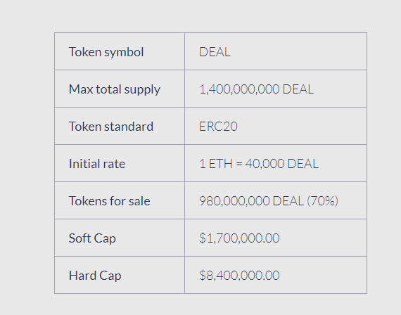 Maximum total supply of DEAL is 1,400,000,000 and no more tokens will ever be issued after that. All unsold tokens by the end of the token sale period will be permanently burned.