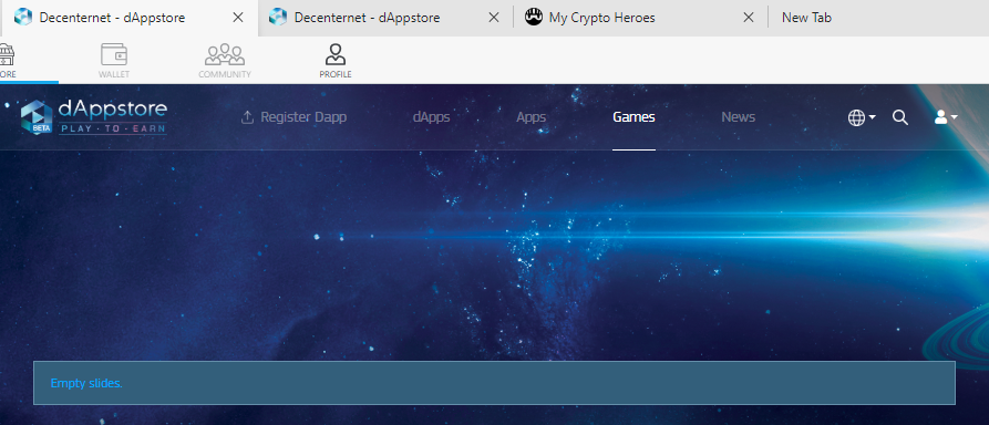 I encountered this issue just today. When I first visited the Games page using Osiris, I didn't have any issue because the games were normally displayed. But when I visited it today, it displayed an "Empty slides" page when I clicked on the https://playdapp.store/ link from the ReviewHunt campaign quest.