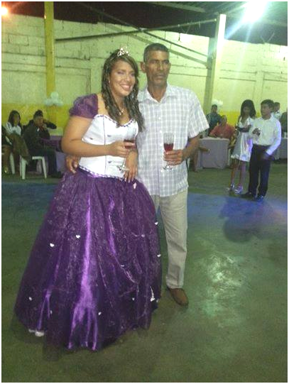 Llego el momento del brindis y su padre junto a ella como siempre no podía faltar, como no si no se ha apartado de ella desde que nació estuvo en sus primeros pasos aun después en su bautizo, cuando se le cayó su primer diente. En su vida siempre ha estado el presente más aun hoy donde da su primer paso de niña a mujer.