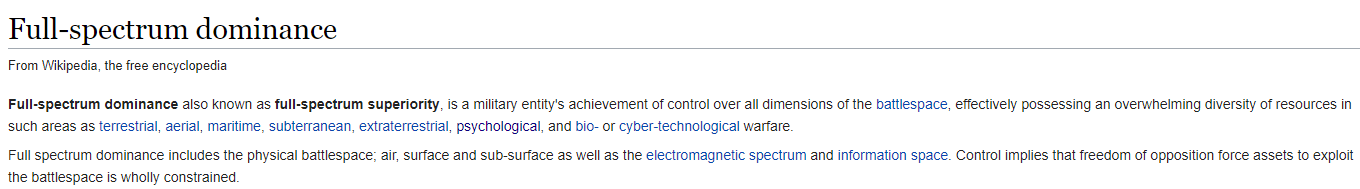 Full-spectrum dominance also known as full-spectrum superiority, is a military entity's achievement of control over all dimensions of the battlespace, effectively possessing an overwhelming diversity of resources in such areas as terrestrial, aerial, maritime, subterranean, extraterrestrial, psychological, and bio- or cyber-technological warfare.