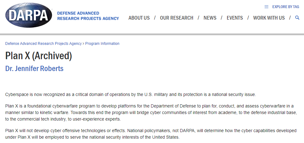 Plan X will not develop cyber offensive technologies or effects. National policymakers, not DARPA, will determine how the cyber capabilities developed under Plan X will be employed to serve the national security interests of the United States.