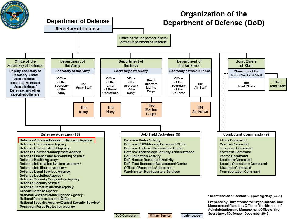 Pictured above, is the overarching structure of the Department of Defense (DoD), which incorporates the Defense Advanced Research Projects Agency (DARPA) and it's Plan X, cyber 'defense' program.
