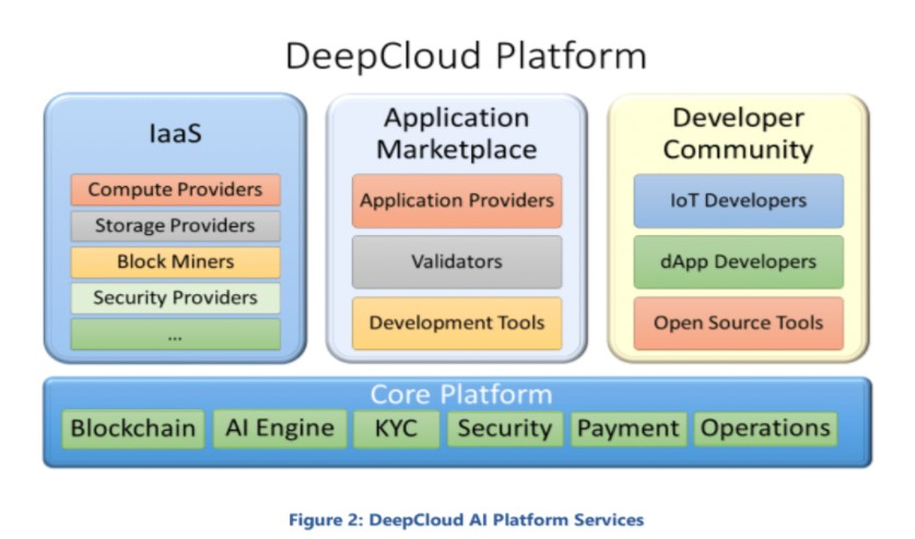 DeepCloud AI’s goal is to function as both an Infrastructure-as-a-Service (IaaS) and Software-as-a-service (SaaS). They want any party to be able to create and deploy software to the DeepCloud network. DeepCloud AI’s Core Platform controller manages the resources and has the AI Matching engine for matching the Network Resource Providers and the Application developers. DeepCloud AI’s Developer Community providers open source tools for the IoT and DApp application developers. Some of these tools are provided by DeepCloud AI itself, other’s will be contributed by the broader community.