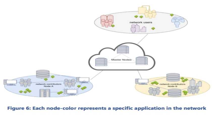 The command centers are controlled by AI. Master nodes organize regular nodes into proper cluster. They match the requests from the network users with the right clusters in real time. In cases of congestion, side-chains will be utilized. (Sidechains are separate blockchains that can conduct cross-chain transactions with a main chain via a two-way peg.)