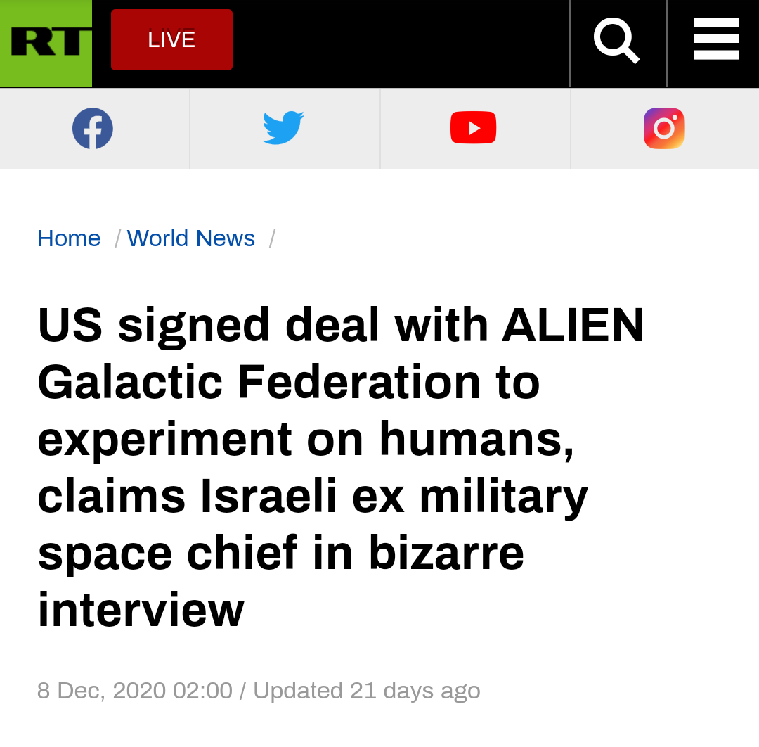"The former head of the Israeli military’s space division has claimed that Tel Aviv and Washington have contacted a “Galactic Federation” of extraterrestrials, but that mankind is not ready for the “truth” about life in the cosmos.