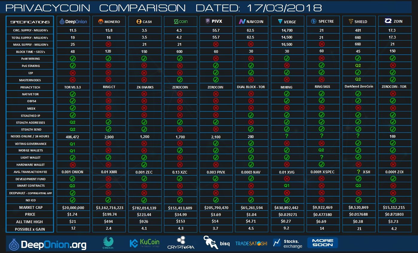I have another update to the privacycoin comparison poster too in my thread on the forum which includes the completion of the DeepOnion Android wallet & Stealth addresses aka DeepProtocol. This is on DeepOnion wallet Version 1.6.0 which is mandatory before block 460,000 . P.S I've just seen your article about the wallet update. Good work..