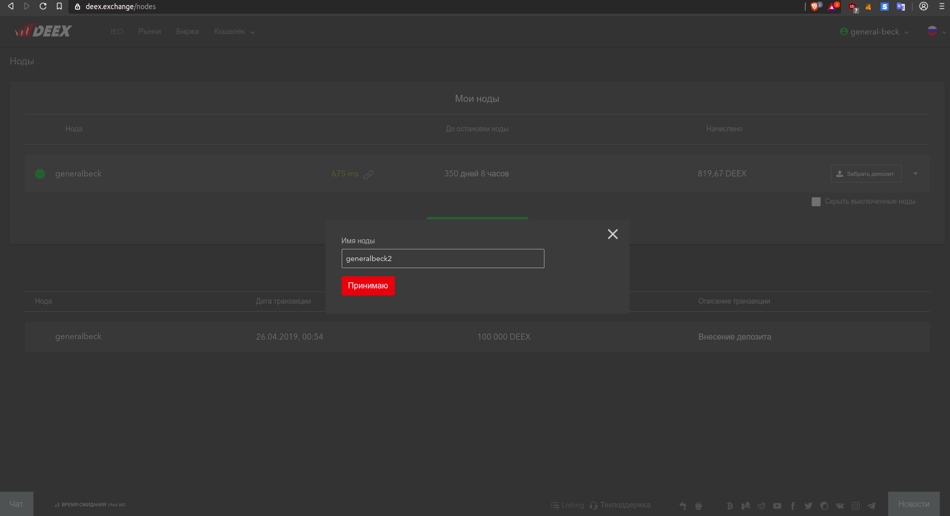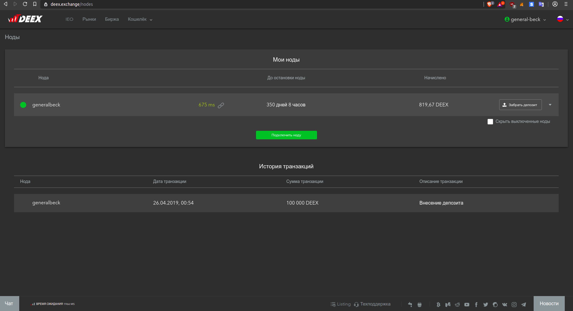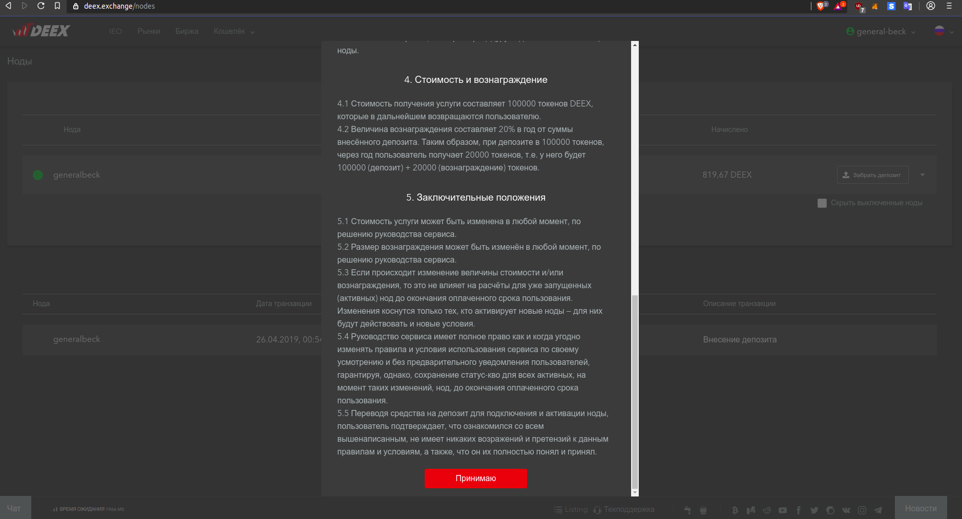 Первый шаг естественно логин и необходимо пополнить депозит на 100000 DEEX. Стоимость получения услуги составляет 100000 токенов DEEX, которые в дальнейшем возвращаются пользователю.