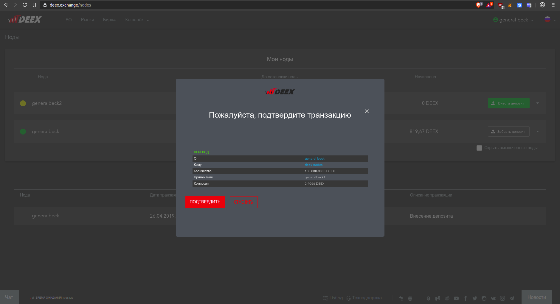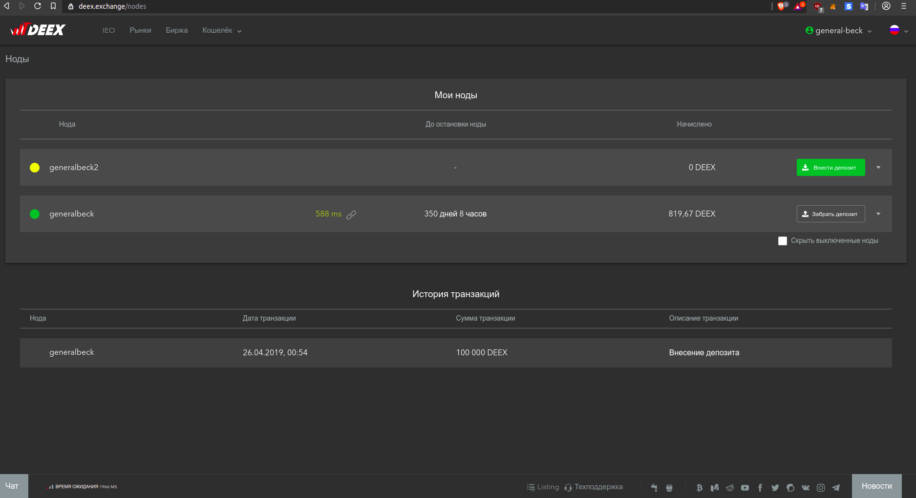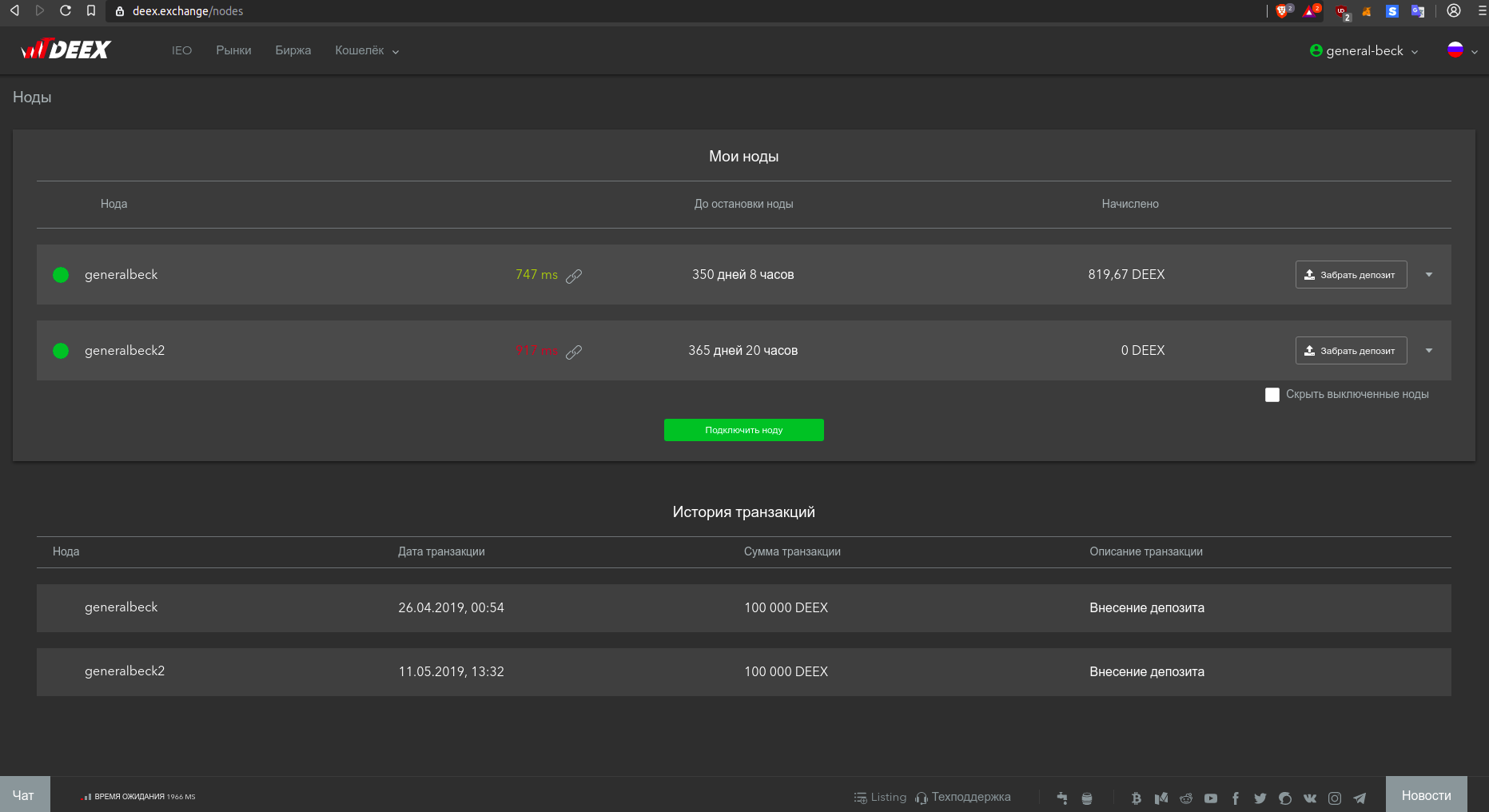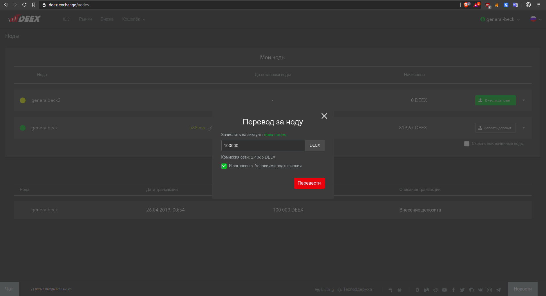 Первый шаг естественно логин и необходимо пополнить депозит на 100000 DEEX. Стоимость получения услуги составляет 100000 токенов DEEX, которые в дальнейшем возвращаются пользователю.
