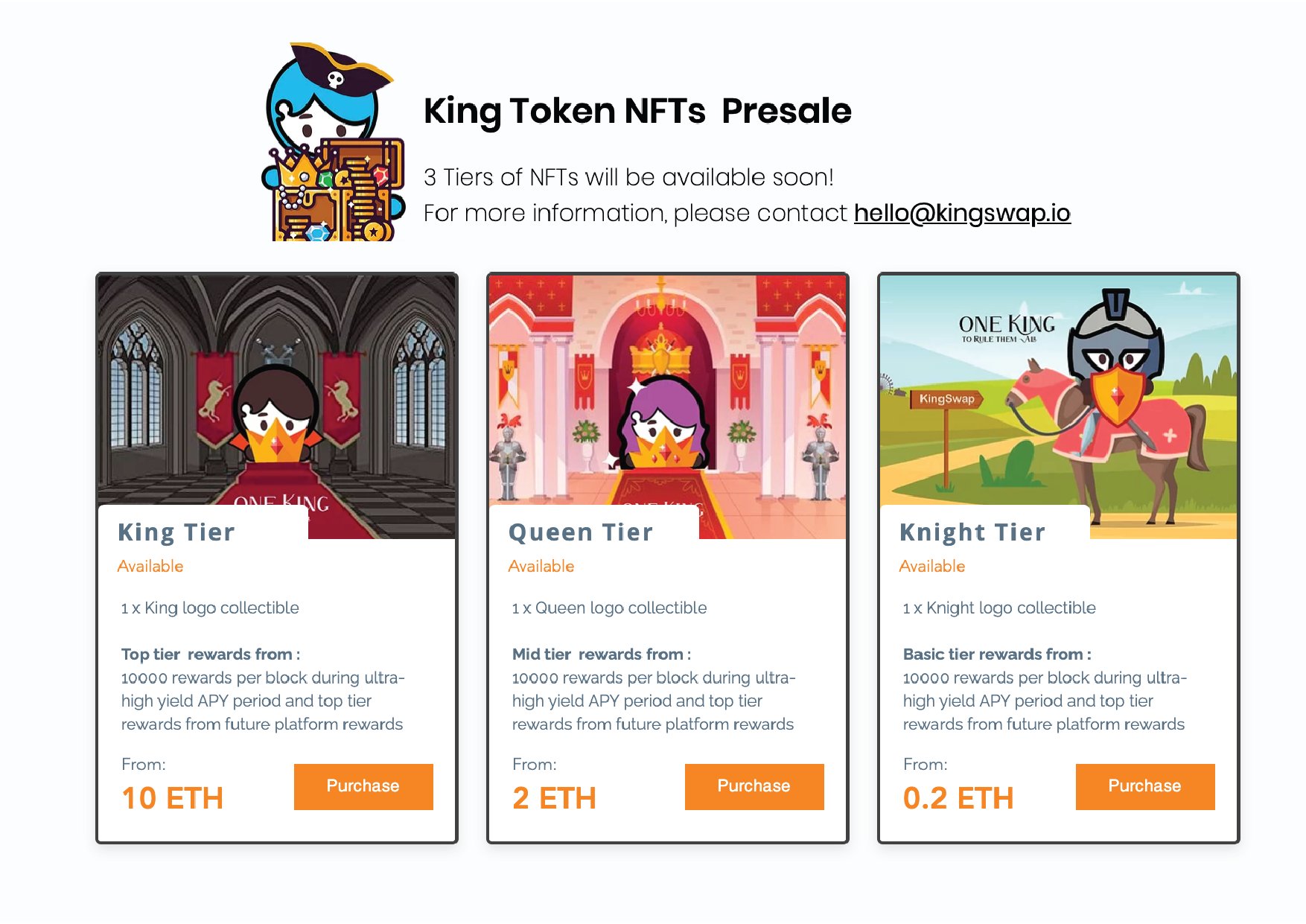 NFTs can now be used through different projects. KingSwap has brought up a way to utilize NFTs in their platform. There are 3 tiers of NFTs available on KingSwap: King tier, Queen tier and Knight tier.