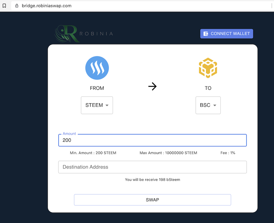 RobinaSwap, is a yield farming and AMM dex, that has a cross-chain bridge that currently supports the Steem and HDAC Blockchain, allowing for native cryptos of these two Blockchains to be transferred to the Binance Smart Chain Network configured metamask. Once Steem from Steemit Blockchain is transferred to Metamask, the Steem becomes wrapped BSteem and can be used in DEFI platform RobiniaSwap.