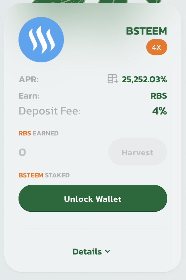 Congratulations, now you will be rewarded with RBS tokens for staking your BSteem in the pool.
