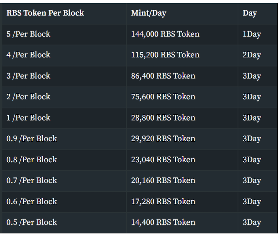 Emission rate of RBS, the native token of RobiniaSwap