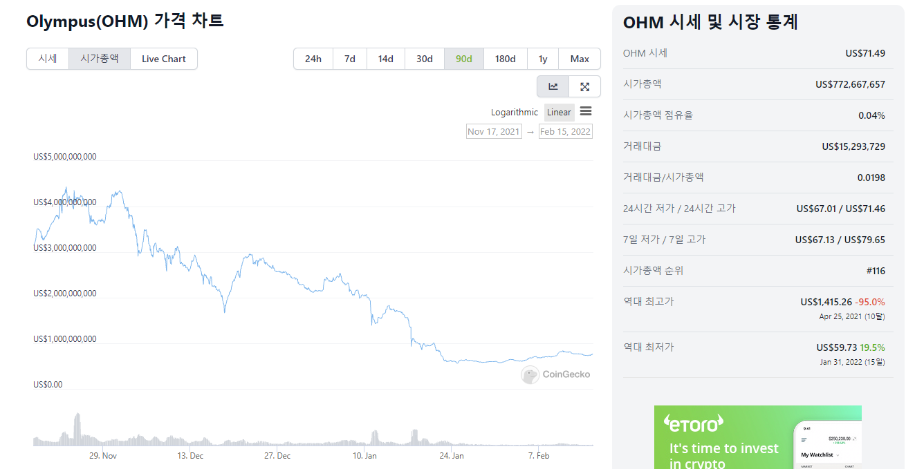 곡갱이 매도 압력을 막기 위한 여러 가지 시도가 있었고 그중에 가장 성공한 것은 디파이 2.0의 시작이라고 불리우는 올림푸스 다오입니다. 올림푸스 다오 이후에 소위 옴포크라는 수많은 디파이들이 생겨났고, 디파이 2.0은 디파이의 큰 흐름으로 자리 잡았습니다.