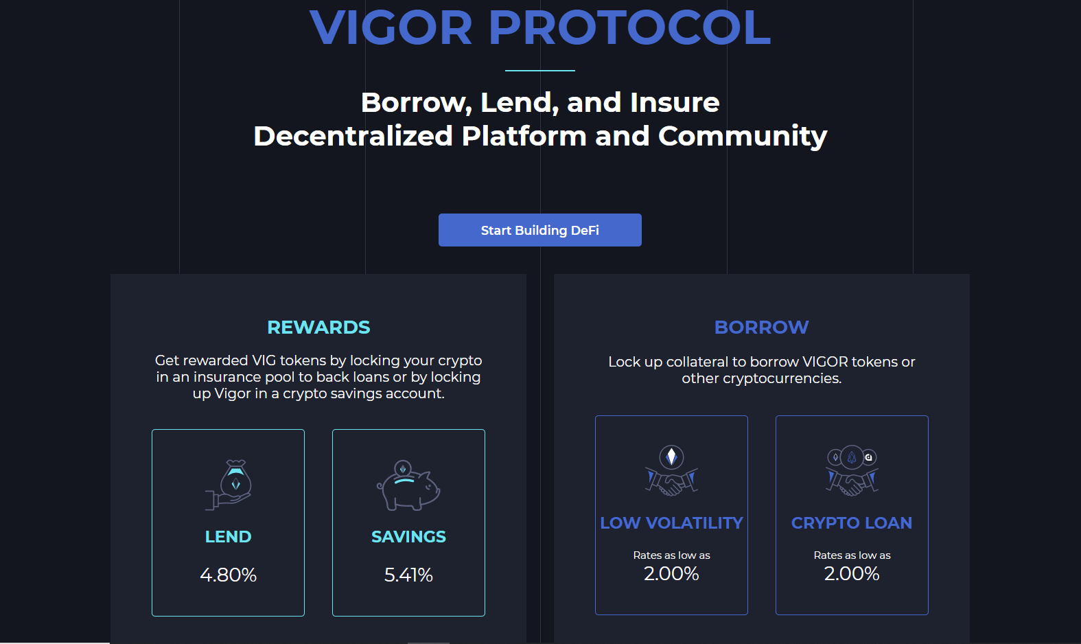 The Protocol employs a two-token system; the fee-utility token VIG and the low volatility VIGOR token backed by a pool of overcollateralized cryptocurrencies. Users can deposit crypto into the lending/insurance pool for rewards or deposit VIGOR into savings for rewards.