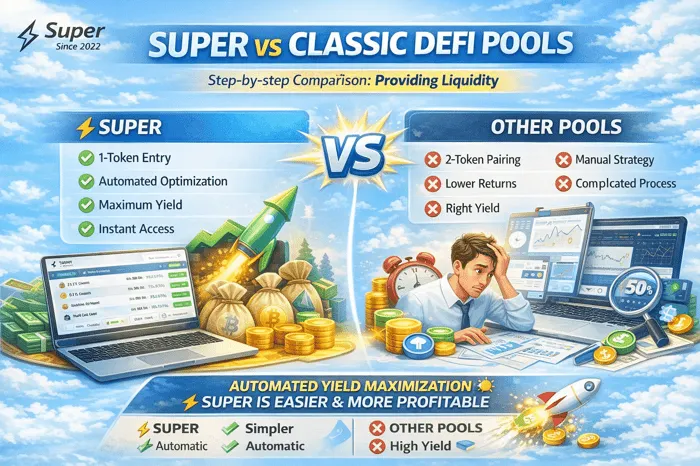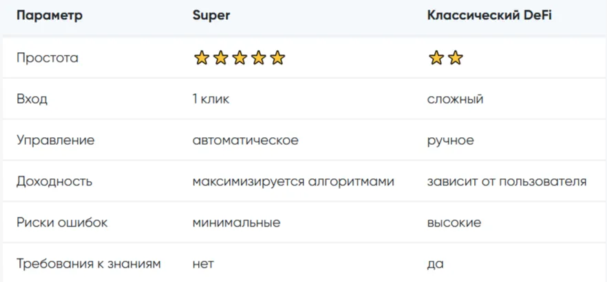 Если ты новичок, главное отличие между Super и классическими DeFi-протоколами — это сложность входа.