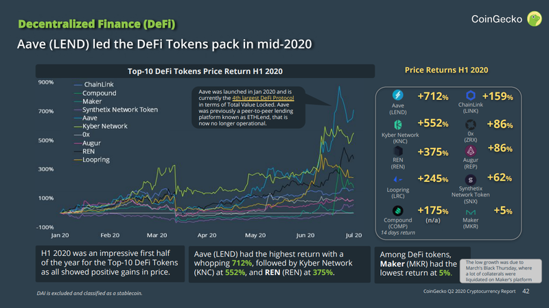 As per the Q2 2020 Quarterly Cryptocurrency Report . Aave(LEND) and Kyber Network lead it from the front: