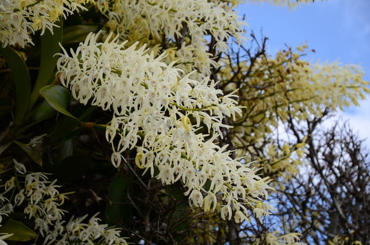 They can be grown on a rock by sitting them on some orchid compost and propping them up with smaller rocks: they will eventually attach themselves to the main rock. They can also be affixed to a tree using an old stocking partially filled with orchid compost in which to anchor the roots - tie the orchid onto the tree with the ends of the stocking. Eventually it will adhere itself onto the bark. They can also grow in cut-up tree stumps. They can also be wired onto boards. If grown in pots, they need very well-drained orchid medium. They should not be planted directly into soil. Give them water, especially in summer, and some liquid fertiliser occasionally in spring and summer. They need sun to promote best flowering. The colour of the flowers can echo cream-coloured Clivia that appear at the same time, and also consorts well with the soft blue flowers of Salvia fallax. Propagate by removing rooted pieces from the clump. The main pest is the dendrobium beetle, which can ruin leaes, new shoots and flowers. Remove them by hand in the early evening. You can flick them into a container with some soapy water at the bottom.