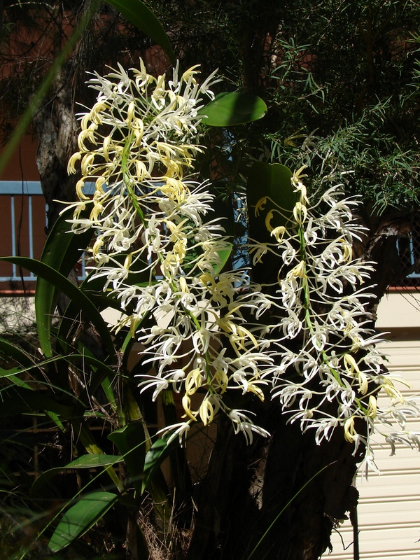 Once in a past life when I was a beginning native dendrobium hybridist emeritus AOC judge Gordon Giles said something to the effect that "the trouble with you native breeders is that you muck around in your backyards with your toothpicks and you still haven't come up with a hybrid that is as good as a decent speciosum". Although this observation rankled a bit at the time I think I know what he was getting at. 'Rock Lilies' can reliably produce long racemes of relatively large white, cream or yellow flowers late in winter or spring and, being native to most of the Australian east coast, will thrive in their home range given minimum care. Dendrobium speciosum Var. speciosum 'National White' HCC/OSNSW is definitely my favourite native and possibly my favourite orchid overall even though there are probably 'better' clones around.