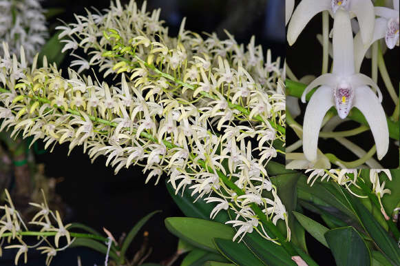 There are two to five thick, leathery leaves originating from the top of each pseudobulb. These leaves can remain on the plant for up to 12 years. The erect or curved pseudobulbs are large, up to 45 cm (18 in) long. They are thickest at their base, measuring 5 to 7 cm (2.0 to 2.8 in), and taper towards the apex (3 cm (1.2 in)). The showy flowers grow in long racemes on straight or slowly arching, long, starchy stems. Some varieties produce 100 or more 2 to 5 cm (0.8 to 2.0 in), sweetly fragrant flowers per raceme in winter or spring. Flower colour, depending on variety, can be white, cream, yellow or dark yellow. Some cultivars have golden hued flowers. The (predominantly) white labellum is covered with purple dots and veined with red and purple.