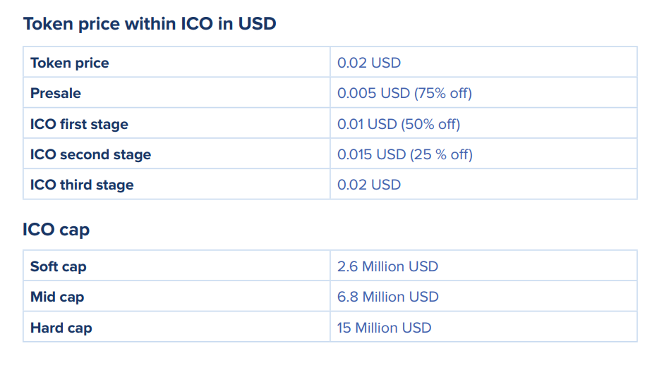 Token fiyatı ön satışta 0.005 $, ICO ilk evrede 0.01 $, ikinci evrede 0.015 $ ve son evrede 0.02 $ olarak belirlenmiş. Soft-cap 2.6 milyon $ iken, çok fazla ICO’da görmediğimiz mid-cap 6.8 milyon $, Hard-Cap ise 15 milyon $ olarak belirlenmiş.